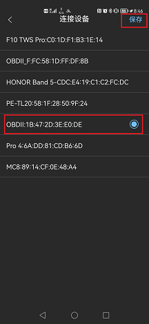 5.选中名称为”OBDII“的设备,再点击”保存“。